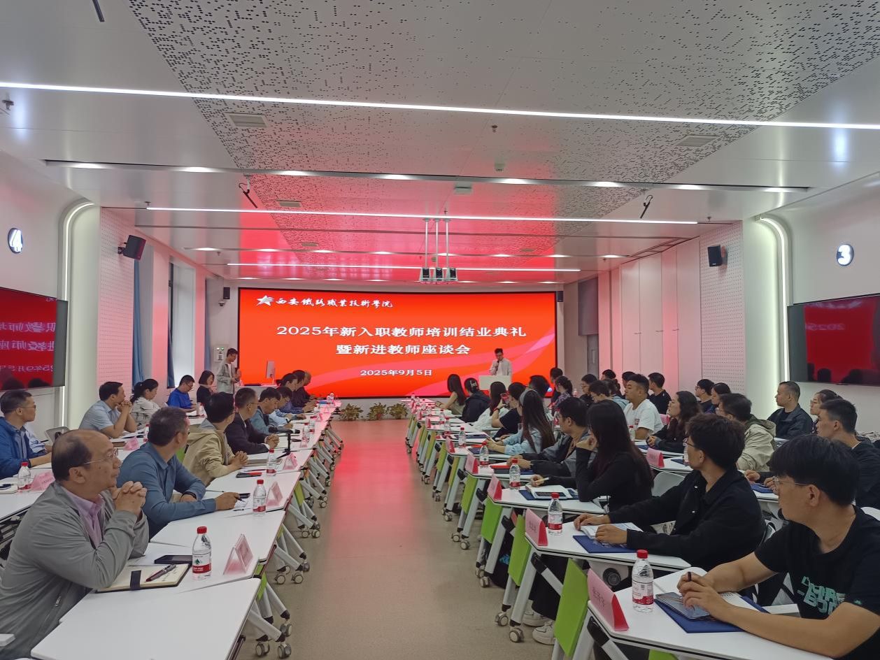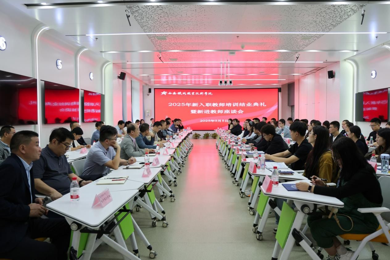 9月5日,学院2025年新入职教师培训结业典礼暨新进教师座谈会在港务校区办公楼三楼思政VR智慧教室举行。党委副书记、纪委书记、监察专员邓轩出席会议,相关院部、处室负责人、39名新入职教师参加,会议由人事处处长赵铁民主持。